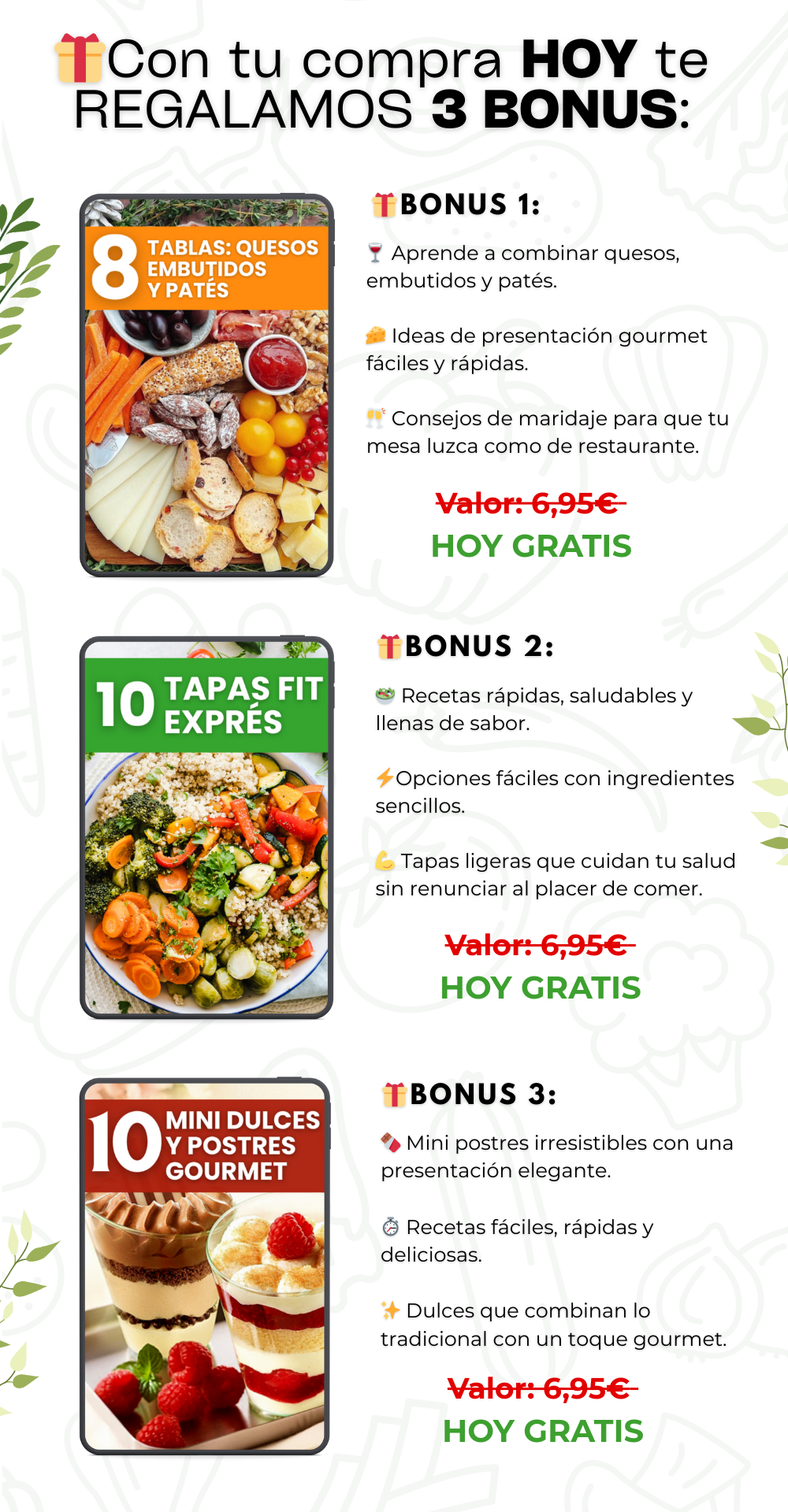 Recibirás el libro principal y los bonus en formato digital PDF, listos para descargar en cualquier dispositivo (móvil, tablet u ordenador). Así podrás llevar las recetas siempre contigo en la cocina.